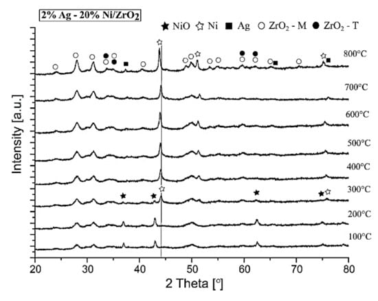 In the next part of the phase composition studies, in order to determine the interaction between the active phase component during the reduction process the XRD “in situ” measurements were done for the selected bimetallic catalyst (2% Ag-20% Ni). The phase composition studies performed during the reduction process of the bimetallic 2% Ag-20% Ni/ZrO2 catalyst performed in hydrogen were given in Figure 10. The diffraction curve of the studied system recorded at 100 °C showed the presence of NiO, as well as crystallographic ZrO2 phases (tetragonal and monoclinic). The increase of the reduction temperature up to 300 °C result in the appearance on the XRD curve the phases ascribed to metallic nickel, nickel oxide and crystallographic structures of ZrO2 (tetragonal and monoclinic phases). Further increasing the reduction temperature did not change the phase composition of the investigated catalytic system up to the final temperature. The only change was the slight shift of the reflexes assigned to metallic nickel phase towards the lower 2 theta angle values. Ni and Ag crystallize in identical crystallographic systems (regular) and space groups (Fm-3m), which facilitates the formation of solid solutions by these metals. However, the results presented in Figure 10 show that, despite a small amount of Ag (2 wt.%) in the sample after the reduction of the main peak (111), Ag (2 theta = 37.7) is clearly visible. So, the observed shift of the reflexes assigned to the metallic Ni is probably associated with the shrinking of the sample at higher temperatures. The XRD results obtained in this study do not clearly confirm the alloying process between metallic nickel and silver. However, based on the XRD measurements, the alloying process of both metals cannot be ruled out.