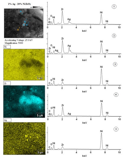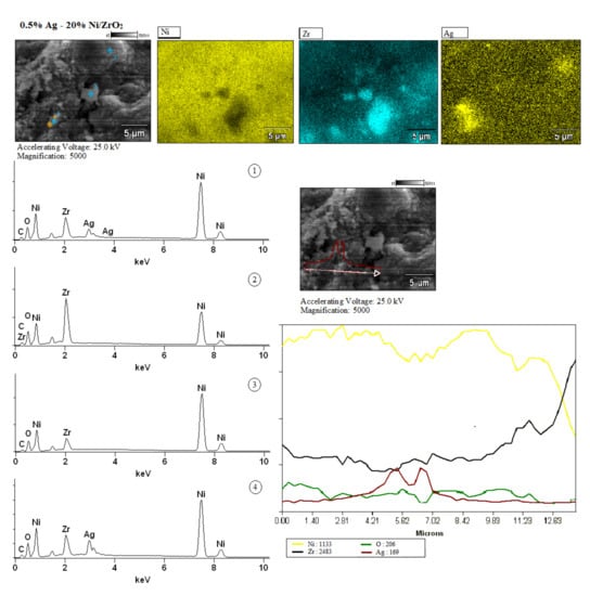 The surface morphology of the studied mono- and bimetallic supported catalysts were performed using scanning electron microscopy (SEM). The qualitative elemental analysis of the selected surface, marked by the points or straight line, were carried out by using an energy dispersive detector. The SEM-EDS measurements were carried out on the surface of the mono- and bimetallic catalysts. The SEM-EDS results are given in Figure 10, Figure 11 and Figure 12 SEM images and EDS spectra’s recorded for the calcined catalysts clearly confirmed the composition of the investigated mono- and bimetallic supported catalysts. Figure 11 presents the SEM images which confirmed the occurrence for 20% Ni/ZrO2 system; the elements such as: nickel and zirconium. In the case of the bimetallic systems x Ag-20% Ni/ZrO2, SEM-EDS analysis showed the presence of Zr, Ni and Ag on the surface of the catalysts. In the next part of the morphology studies, the selected areas located on the investigated catalysts were analysed (see Figure 12 and Figure 13). The selected areas were marked by the points or straight line. The point scan allowed one to focus the x-ray beam on a single point and to compare their composition. The surface analysis performed for the 1% Ag-20% Ni/ZrO2 catalyst is presented in Figure 12. In the case of bimetallic catalysts containing 1 wt.% of Ag five points were selected in different sample surface spots. The spectra collected for 1% Ag-20% Ni catalyst were marked from 1 to 5. The analysis of the first, second and fourth points located close to each other on the sample surface showed the simultaneous occurrence of the Ag, Ni, Zr and O elements. Meanwhile, in the case of 3 and 5 points, the recorded spectra confirmed the occurrence only in Ni, Zr and O elements. Figure 13 presents the results of the surface analysis of the 0.5% Ag-20% Ni/ZrO2 catalyst. In the case of the surface analysis of this system, the spectra from four points were also collected. In addition, an analysis of the surface marked by a straight line was done. As a result of the analysis, we received a graph showing the concentration of individual elements present on the surface along the tested line. The obtained results clearly indicate the changes in the content of each elements along the investigated line. A surface analysis carried out along the line showed that in the scanned range from 4 to 8 microns, we observed the increase of the silver content and decrease of the nickel content. This result confirm that Ag cover Ni species and can confirm the interaction between nickel with silver. This behaviour agree well with the literature data [,] and agree well with our previous reduction studies. The interaction between Ag and Ni explain the reactivity results obtained in the studied processes. Moreover, above 9 microns, the zirconium content increases significantly simultaneously with a decrease in the nickel content. Meanwhile, the spectra’s collected from the indicated points located close together confirmed the occurrence of silver, nickel, zirconium and oxygen (points 1 and 4). Whereas, for others investigated points (points 2 and 3) located on the surface, only the presence of nickel, oxygen and zirconium were detected. The obtained results of SEM images, points and line spectra analysis correlate well with each other.