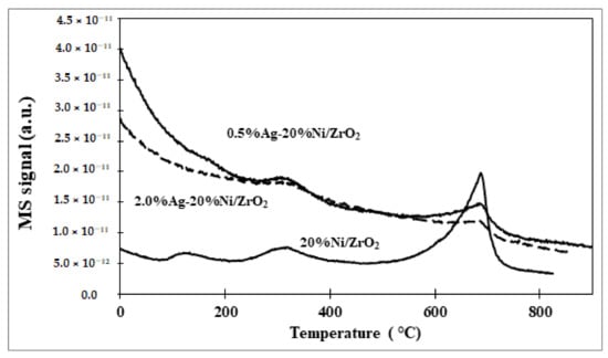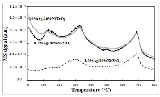 In the case of monometallic nickel catalysts 20%Ni/ZrO2 three peaks of CO2 desorption during carbon deposition oxidation were also observed at the same temperatures (130, 300 and 690 °C—see Figure 15). The peak of CO2 formation, with the maximum at 130 °C (see MS profile), is assigned to the removal of amorphous carbon. The second peak is attributed to the oxidation step of the oligomerized carbon species, which is signed as ß carbon (Cß), or carbides. While, the last peak, located at about 690 °C, is connected with the oxidation of graphite carbon (Cγ) bulk carbides []. It is also worth noting that, in the case of this system, we observed the highest intensity of CO2 desorption peak at high temperature compared to the bimetallic catalysts containing 0.5 and 2 wt.% of Ag (see Figure 15). This result showed that a small addition of silver reduces the amount of the carbon deposit formation during the oxy-steam reforming of LNG process. Parizotto et al. [] reported about the high stability of the bimetallic Ag-Ni catalysts in reforming of methane process, which exhibited high resistance to coke deposition. This behaviour was caused by the geometric effect of Ag, changing the structure of Ni centres on which the nucleation and growth of graphitic structure take place and by the decrease of the carbon deposit formation rate. In addition, DFT and kinetics investigations showed that the apparent activation energy increases with increasing of the Ag content on the catalyst surface, which further explains our results of catalytic activity.