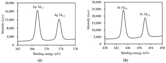 XPS analyses were performed to verify the surface chemical composition and the valence state of elements of the Pt/AgInS2 powder (Figure 4). The spectra of the Ag species (Figure 4a) manifested two symmetric peaks at binding energies of 367.4 and 373.4 eV with a separation of 6 eV, conforming to Ag+ ion. They are attributed to the spin-orbit splitting characteristic of Ag 3d5/2 and Ag 3d3/2, respectively. The peaks in Figure 4b were observed at about 444.4 and 452.0 eV which are the characteristic of In 3d5/2 and In 3d3/2, respectively, corresponding to the presence of indium as In3+ [34]. The S 2p spectrum in Figure 4c displayed a strong XPS peak at 161.4 eV, indicating the presence of S2− species in the AgInS2. The XPS analyses corroborate the XRD results and affirm the composition of the AgInS2 material. Considering the presence of the Pt dopant in the synthesized materials, Figure 4d shows the XPS for Pt 4f with peaks located at 70.8 and 74.0 eV, corresponding to the binding energies of Pt 4f7/2 and Pt 4f5/2 [35]. It has been reported that Pt0 exhibits Pt 4f7/2 and Pt 4f5/2 bands in the ranges of 70.2–71.0 and 73.6–74.0 eV, respectively [36]. The XPS result indicated that the oxidation state of Pt on Pt/AgInS2 is Pt0.