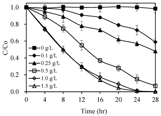 The amount of the photocatalyst (catalyst dosage) is a parameter that has important effects on photodegradation rates of organic compounds [39,40]. This parameter was examined by using different concentrations of 1.0 wt% Pt/AgInS2 (0.1 to 1.5 g L−1) in the pirimicarb degradation. The results are shown in Figure 8. In the absence of the catalyst, the degradation of pirimicarb was negligible up to 24 h under visible-light irradiation. The result highlighted the important role of the Pt/AgInS2 in this application. Figure 8 further displays that the increase in Pt/AgInS2 concentration from 0.1 to 1.0 g L−1 led to a substantial enhancement of the photodegradation efficiency from 27%–98% under visible-light irradiation for 24 h. The optimal catalyst dosage was found to be 1.0 g L−1, after which the degradation rate begins to be in equilibrium. The enhanced photodegradation rates with the increase of the Pt/AgInS2 dosage can be attributed to the increase in the total surface area (accessible active sites) available for the photocatalytic reaction [41]. Upon catalyst overdose, scattering of incident light and less penetration might occur, causing a loading of 1.5 g/L to have similar degradation rate of pirimicarb as 1.0 g/L.