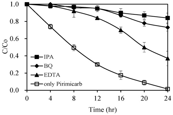 Photocatalytic degradation of pirimicarb with 1.0 wt% Pt/AgInS2 photocatalyst in the absence and presence of scavengers (isopropanol (IPA), ethylenediaminetetraacetic acid (EDTA), and benzoquinone (BQ)) under visible-light irradiation. Experimental conditions: pirimicarb concentration 10 mg L−1; 1.0 wt% Pt/AgInS2 concentration 1.0 g L−1; scavenger concentration 1 × 10−3 M; pH 5. Error bars represent the standard deviations of duplicate runs.
