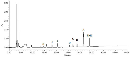 The analysis of intermediate products was carried out in order to further understand the photodegradation pathway of pirimicarb using Pt/AgInS2. The chromatogram of the pirimicarb solution after treatment with Pt/AgInS2 under visible-light irradiation for 16 h is shown in Figure 13. The last peak at 34.11 min represents the pirimicarb (PMC) reactant. Peaks A–G label the main intermediates in the photodegradation process since their intensities increase then subsequently decrease (Figure S1). The summary of the detected chemical entities in this process, their characteristic ions of mass spectra, as well as retention times is depicted in Table 4. The presence of many pirimicarb degradation products can be attributed to the lack of selectivity of the active radical species (•OH and •O2−) that may attack pirimicarb or the subsequent intermediates at different reactive sites.