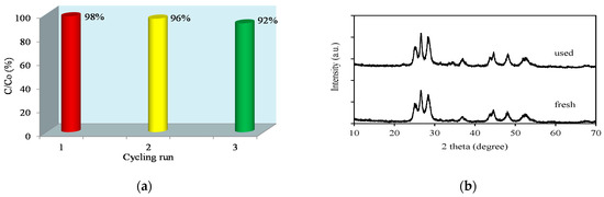 Practical application of catalysis strongly depends on the reusability and stability of the catalyst materials. For this purpose, the performance of Pt/AgInS2 materials was studied in three consecutive runs of photodegradation of pirimicarb under visible-light irradiation. The Pt/AgInS2 catalyst was collected after each run, dried, and reused under the same experimental conditions. As shown in Figure 15a, the photocatalytic activity of Pt/AgInS2 was consistent after three successive catalytic tests with 98%, 96%, and 92% degradation of pirimicarb, respectively. In addition, Figure 15b displays that the XRD patterns of the used Pt/AgInS2 powder after the reaction match closely the patterns of the fresh powder before usage, with minor differences in the relative intensities only [31]. The experiments show that the Pt/AgInS2 system is significantly stable and reusable for long-term practical photocatalytic processes without photocorrosion risk.