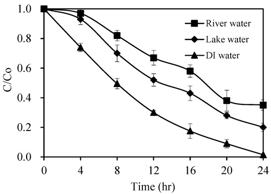 The visible-light driven Pt/AgInS2 photocatalysis was applied to study the degradation of pirimicarb in the natural water as a reaction medium. The results are summarized in Figure 16 which shows the photodegradation rates of pirimicarb in deionized water and natural water. In the presence of Pt/AgInS2 photocatalyst, pirimicarb concentration in the natural water samples was found to decrease upon irradiation time. The degradation rate of pirimicarb in natural water samples was slightly reduced in comparison to that in deionized water. This can be due to the presence of organic matter and anions in environmental water (Table 5), which can slightly deactivate the catalyst or compete with the target pirimicarb for the active sites [51]. Despite this slight decrease in rates, the photocatalytic activity of Pt/AgInS2 in the degradation of pirimicarb is still noticeable even in natural water scenarios, demonstrating the efficiency and prospect of the prepared catalytic system for practical environmental and waste water treatment.