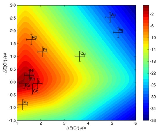 Two-dimensional volcano-curve of the turn over frequency (log10) as a function of O and C adsorption energy. T = 773 K, P = 1 bar; 10% conversion. The error bars include an estimated 0.2 eV uncertainties in the adsorption energies [].