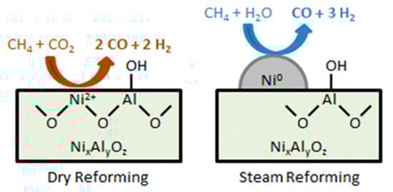 In addition, it was observed that supports such as Al2O3 and SiO2 allow a gradual oxidization of Ni catalysts during SMR at 500 °C under ambient pressure, whereas the utilization of ZrO2 stabilized Ni particles and allowed for higher methane conversion than aforementioned supports. It is mainly because the ZrO2 support allows a water accumulation, favoring the formation of hydroxyl groups which promotes SMR []. CeO2 has also been widely studied as both a support and promoter of Ni-based catalysts because of its high thermal stability, mechanical resistance, and high oxygen storage capacity. Dan et al. studied SMR over an Al2O3 supported Ni catalyst, which was previously modified with CeO2 and La2O3. They observed that the morphological characteristics (i.e., surface area, nickel dispersion) are responsible for the enhanced catalytic properties including larger methane conversion and a further decrease of coke formation []. As a summary, CeO2, ZrO2, and their mixed oxides are largely used as supports or support dopants, owing to their high oxygen storage capacity, redox properties, and consequently sufficient resistance to coking, leading to superior catalytic performance compared to conventional Al2O3 or MgAl2O4 supports [].