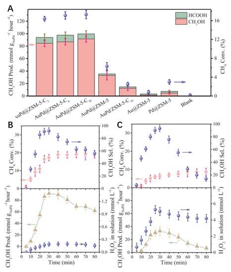 (A) CH4 conversion and methanol selectivity over different catalysts. Dependences of the methane conversion (Conv.), methanol selectivity (Sel.), methanol productivity (Prod.), and H2O2 concentration in aqueous solution on reaction time over (B) AuPd@ZSM-5-C16 and (C) AuPd@ZSM-5 catalysts [].
