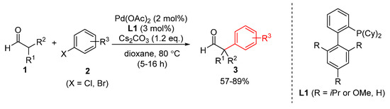 In 2007, Buchwald and coworkers proposed the palladium-catalyzed α-arylation of aldehydes with bulky, electron-rich phosphine ligands (Scheme 2) [16]. Although the reaction conditions were also favorable for aldol condensation, a trace amount of water promoted the equilibrium of the retro-aldol reaction to regenerate the aldehyde from the self-aldol product. The bulky and electron-rich phosphine ligand (L1) played a crucial role in aryl halide 2 activation by palladium in the 1st step of the catalytic cycle, namely, oxidative addition. Products 3 bearing a quaternary carbon were successfully generated via this method.