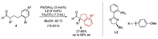 An asymmetric version of the palladium-catalyzed α-arylation of aldehydes has been developed (Scheme 3) [17]. Using chiral phosphanyloxazoline ligand L2, desired chiral quaternary aldehydes 5 could be obtained in high enantioselectivities and yields via an intramolecular pathway. This was the first example of the metal-catalyzed asymmetric aldehyde α-arylation.