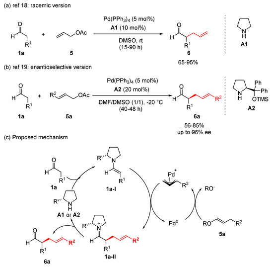 Cordova and coworkers conducted the α-allylation of aldehydes and ketones utilizing two different catalytic systems, palladium catalysis, and organocatalysis (Scheme 4). Specifically, the carbonyl reagents were converted to reactive enamine species by the addition of a secondary amine organocatalyst, and allyl acetate was converted to a π-allyl-Pd species. These two catalytic activation processes were successfully combined to enact α-allylic alkylations. Pyrrolidine A1 was used as the organocatalyst, and only 10 mol% was required for the generation of reactive enamine 1a-I from the corresponding aldehyde 1a (Scheme 4a). In the case of ketones, 30 mol% of pyrrolidine catalyst provided the desired product in high yield [18]. Enantioselective α-allylic alkylation was carried out by using chiral pyrrolidine catalyst A2 (Scheme 4b) [19]. This was the first direct catalytic intermolecular regiospecific, highly chemo- and enantioselective α-allylic alkylation of linear aldehydes, employing simple chiral amines and palladium catalysts. (R)-3-Methyl-N-(2-phenethyl)-pyrrolidine and (S)-arundic acid were synthesized by this enantioselective α-allylic alkylation as a key reaction.