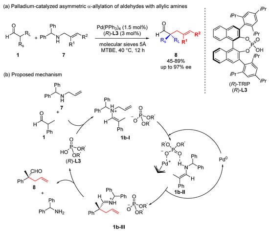 List and coworkers reported the palladium-catalyzed enantioselective Tsuji–Trost-type α-allylation of aldehydes using chiral counter anion/anionic phosphoric acid ligands (Scheme 5) [20]. Although the traditional palladium system for the Tsuji–Trost allylation involved neutral ligands, here, an enamonium phosphate salt was first generated by the reaction among the secondary allylamine 7, aldehyde 1, and chiral phosphoric acid ligand (R)-L3 ((R)-TRIP, TRIP = 3,3′-bis(2,4,6-triisopropylphenyl)-2,2′-binaphtholate). The cationic π-allyl–Pd complex 1b-II was generated by palladium(0), followed by α-allylation to afford chiral iminium 1b-III in an enantioselective manner. Finally, the desired chiral aldehyde 8 was obtained by hydrolysis, with regeneration of chiral phosphoric acid (R)-L3 (Scheme 5b). Formal synthesis of (+)-cuparene was demonstrated by this asymmetric α-allylation.