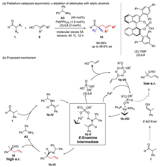 Allylic alcohols were used as allylic partners in the palladium-catalyzed asymmetric α-allylation of aldehydes assisted by chiral phosphoric acid ligands (Scheme 6) [21]. Unlike the above-mentioned case, the reaction required 40 mol% of α-aminodiphenylmethane A3 as a cocatalyst for the generation of reactive enamine intermediate 1b-IV. Meanwhile, chiral phosphoric acid (S)-L3 readily activated allyl alcohols 9 to produce the cationic chiral π-allyl–Pd complex 1b-VIII. Then, the enamine intermediate 1b-V, generated from bulky enamine 1b-IV and Pd complex 1b-VIII, directed the enantioselective α-allylation to generate all-carbon quaternary stereogenic centers. Without the generation of an enamine, enol substrates could not provide a sufficiently strong binding site for the chiral π-allyl–Pd complex 1b-VIII, thus the product was obtained in low e.r.