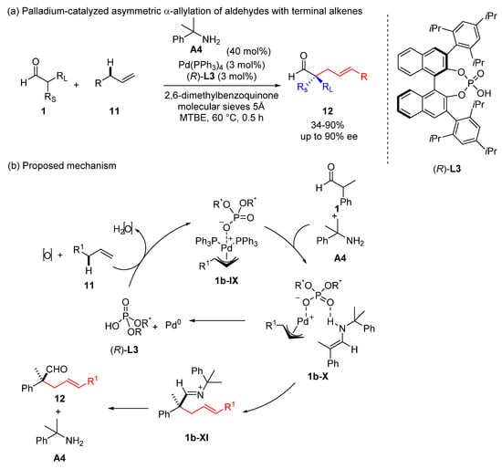 (a) Palladium-catalyzed asymmetric α-allylation of aldehydes with allylic alcohols and (b) proposed mechanism.