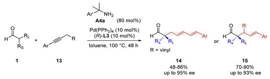 Recently, alkynes were employed as alkylating reagents for the palladium-catalyzed asymmetric α-allylation of aldehydes (Scheme 8) [23]. A chiral hydridopalladium catalyst mediated the isomerization of alkynes 13 to the corresponding allenes, which in turn were converted to chiral π-allyl–Pd complexes via substantial hydropalladation. The reactive enamine intermediates, derived from aldehydes 1 and amino catalyst A4a, underwent asymmetric allylic substitution to afford coupling products 14 or 15.