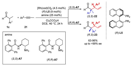 Dong and coworkers reported the Rh-catalyzed enantioselective α-allylation of aldehydes with alkynes (Scheme 10) [25]. In this system, the combination of rhodium and chiral phosphine (R)-L5 was employed as the principal catalyst, and chiral Jacobsen amines ((S,S)-A7 and (R,R)-A7) were incorporated. Harnessing the dual role of the chiral Rh catalyst and chiral amines, γ,δ-unsaturated aldehydes 22 and 23 were efficiently synthesized with high regio- and stereoselectivity.