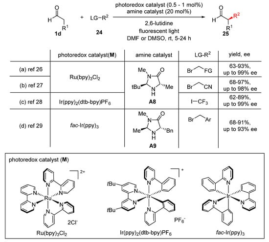 2.3. Organocatalyst-Assisted Photoredox-Catalyzed α-Alkylation of Aldehydes