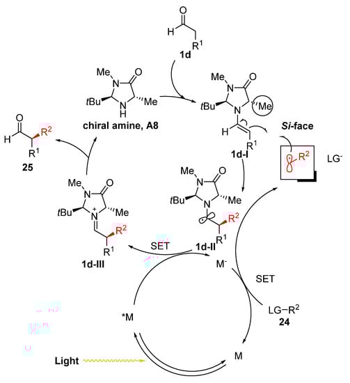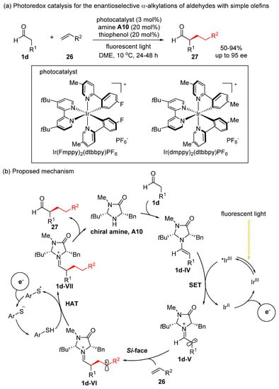 Simple olefins have been enrolled for the α-functionalization of aldehydes through photoredox methodology (Scheme 13) [30]. In the proposed mechanism (Scheme 13b), the Ir photoredox catalyst generates enaminyl radical 1d-V from chiral enamine 1d-IV via SET, and the ensuing rapid enantioselective addition of terminal olefin 26 onto the radical 1d-V provides secondary alkyl radical 1d-VI. The subsequent thiol-mediated hydrogen-atom transfer (HAT) and hydrolysis deliver the desired α-alkylated aldehydes 27 in high ee.