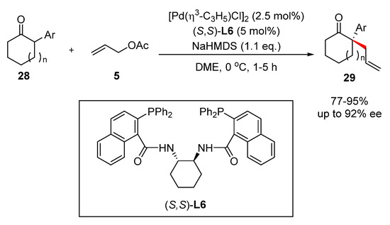 The generation of all-carbon quaternary chiral centers is a challenging task in organic synthesis due to the difficulty in forming sterically crowded C–C bonds. The palladium-catalyzed asymmetric allylic alkylation of prochiral nucleophiles is one of the most straightforward strategies for the synthesis of quaternary chiral centers. In 2002, Trost and coworkers developed a convenient synthetic method for the assembly of chiral α-all-carbon quaternary centers via palladium-catalyzed asymmetric allylic alkylation of α-aryl ketones (Scheme 14) [31]. α’-Unblocked enolates were prepared from α-aryl ketones 28 with a base, such as LDA (lithium diisopropylamide) or NaHMDS (sodium bis(trimethylsilyl)amide), and the subsequent asymmetric palladium-catalyzed allylation formed the quaternary chiral centers of cyclohexanones 29. A key feature of the reaction is the chiral π-allyl-Pd intermediate, which is generated from the palladium–chiral ligand complex (Figure 1). Enolate nucleophiles can be added to the chiral π-allyl-Pd intermediate enantioselectively to give α-aryl cyclohexanones 29 in high ees.