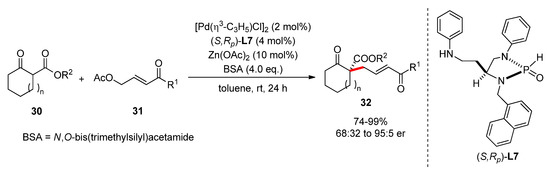 In 2005, Hamada and coworkers conducted another palladium-catalyzed asymmetric allylic alkylation, forming chiral all-carbon quaternary centers (Scheme 15) [32]. Cyclic β-keto esters 30 were utilized as prochiral nucleophiles, and γ-acetoxy-α,β-unsaturated carbonyls 31 generated chiral π-allyl-Pd intermediates with a palladium catalyst and chiral ligand (S,Rp)-L7. Although the reaction scope was limited to cyclic β-keto esters 30, this was the first account of quaternary carbon center assembly using γ-acetoxy-α,β-unsaturated carbonyl compounds 31 in the palladium-catalyzed asymmetric allylic alkylation.