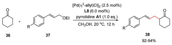 Allylic alkyl ethers were also applied for the generation of Pd-allyl intermediates in protic solvents (Scheme 18) [34]. The hydrogen-bond-activated palladium-catalyzed allylic alkylation via allylic alkyl ethers 37 with carbonyl compounds 36 provides highly linear regioselective α-allylated products 38 under mild conditions.