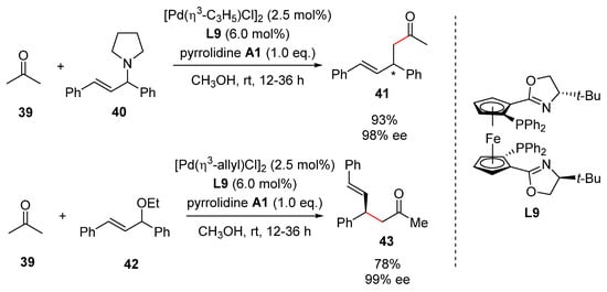 Moreover, an asymmetric version of the reaction was successfully performed with chiral ligand L9 to give highly optically pure products 41 and 43 in excellent yields (Scheme 19). This asymmetric allylic alkylation successfully demonstrated the formal synthesis of the selective antimuscarinic agent 7.