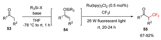 The proposed reaction mechanism is described in Scheme 25. The reaction is initiated by the formation of enolsilane 54 from ketone 53, promoted by trialkylsilyl chloride and an amine base. The electrophilic trifluoromethyl radical, generated in the photocatalytic cycle, combines with enolsilane 54 to provide α-silyloxy radical 54-I. In the photoredox cycle, the [Ru(bpy)3]2+ photocatalyst is excited by light to generate the excited photocatalyst *[Ru(bpy)3]2+. The excited photocatalyst is rapidly reduced to [Ru(bpy)3]+ by single-electron reduction, and the α-silyloxy radical 54-I is simultaneously oxidized to silyl oxocarbenium 54-II, which is easily hydrolyzed to the desired α-trifluoromethylated ketone 55. The reduced photocatalyst [Ru(bpy)3]+ reacts with CF3I to generate the trifluoromethyl radical via SET, and the [Ru(bpy)3]2+ photocatalyst is regenerated. The utility of this one-pot α-trifluoromethylation protocol was well-demonstrated with a broad range of carbonyl derivatives, such as amides and esters.