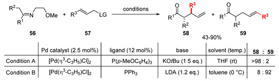 Since the development of the Tsuji–Trost reaction, palladium-catalyzed allylic alkylation reactions have become one of the most intensely-studied and useful reactions in organic synthesis. In the majority of cases entailing carbon nucleophiles, the reactions provide thermodynamically stable linear products. The development of synthetic pathways for branched allylic products is challenging, and only a few examples have been reported. In 2011, Wu and coworkers devised the palladium-catalyzed allylic alkylation of α-carbanions derived from imines (Scheme 26) [41], and this is a unique example of the generation of the branched allylic product. The ratio of branched and linear products could be excellently controlled by the choice of reaction conditions; branched products were dominant in the presence of P(p-MeOC6H4)3 ligand and KOtBu, while linear product selectivity occurred in the presence of PPh3 ligand and LDA.