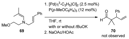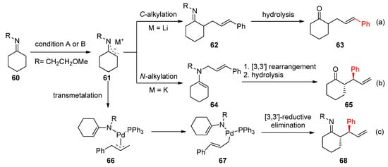 With the use of LDA, the imine substrate 60 produces a Li+-captured enamide anion intermediate and the ensuing well-known C-alkylation-delivered linear product 62 (Scheme 27a). With a softer base, such as KOtBu, on the other hand, N-alkylation affords the N-alkyl-N-allyl enamine 64 to produce the branched product 65 via [3,3′]-rearrangement (Scheme 27b).