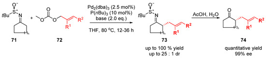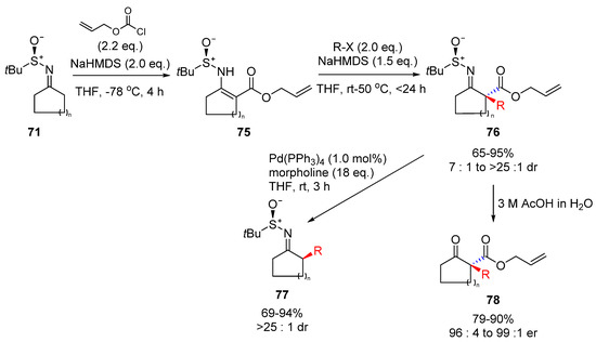 - Li, J.; Dawood, R.S.; Qin, S.; Liu, T.; Liu, S.; Stockman, R.A.; Jiang, S.; Yang, G. Palladium-catalysed α-allylation of chiral sulfinimines derived from symmetric cyclic ketones. Tetrahedron Lett. 2017, 58, 1146–1150. [Google Scholar] [CrossRef]