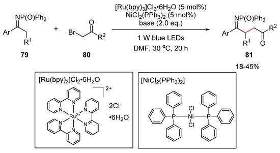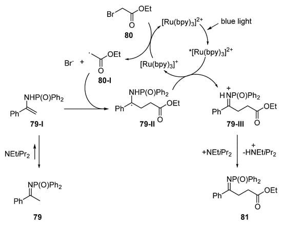 The proposed reaction mechanism is shown in Scheme 33. Enamine 79-I is generated from imine 79 via tautomerization, and the ensuing addition of the electron-poor α-carbonyl radical 80-I to electron-rich enamine 79-I generates α-amino radical 79-II. In the photoredox catalytic cycle, [Ru(bpy)3]2+ is excited by blue LED light to provide the excited photocatalyst *[Ru(bpy)3]2+. The excited photocatalyst oxidizes α-amino radical 79-II to iminium 79-III via SET (Single Electron Transfer), and the alkylated product 81 is subsequently obtained by deprotonation. The reduced ruthenium catalyst [Ru(bpy)3]+ assists the generation of the α-carbonyl radical 80-I from α-bromo carbonyl 80 via SET to regenerate the [Ru(bpy)3]2+ photocatalyst.