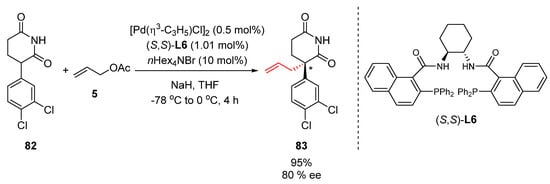 Asymmetric allylic alkylation is an effective synthetic tool for the assembly of chiral quaternary carbon centers and allows the structural tunability of organic molecules. Although a plethora of transition metal-catalyzed asymmetric allylic alkylations have been reported (see the allylation references in Table 1), controlling the stereoselectivity of the generated quaternary center is challenging, and the substrate scope is largely limited to the amide moiety. In 2007, a chiral aryl allyl glutarimide was synthesized by the direct alkylation of glutarimide enolates (Scheme 34) [46]. The chemo-, regio-, and stereoselective reaction employed a catalytic amount of nHex4NBr and a highly reactive C-nucleophile to deliver the chiral quaternary carbon center with no N-allylation being observed. As a result, product 83 was isolated in 95% yield and 80% ee with the use of chiral Trost-ligand (S,S)-L6 in the palladium-catalyzed allylation. 3-Aryl-2-piperidinones were also successfully utilized in this method to provide all-carbon-substituted chiral quaternary stereocenters [47].