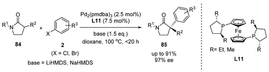 Allylic alkylation and enantioselective α-acylation of γ-butyrolactams has been investigated for syntheses requiring 5-membered N-heterocyclic building blocks. The value of this approach is that γ-butyrolactam, a cyclic amide moiety, is a key framework of various pharmaceutically and agrochemically active molecules. In earlier studies, this methodology was only applicable to α-unsubstituted piperidinones, which necessitate basicity-controlled zinc–enolate formation, and to oxindole derivatives, which do not require strong bases or high temperature conditions. In 2019, the transition metal-catalyzed enantioselective α-arylation of γ-lactams was reported by the Stoltz group (Scheme 35) [48]. Interestingly, the ligand of choice, dialkyl bisphosphine L11, formed a highly stable palladium–ligand complex, capable of withstanding high reaction temperatures and basic conditions. This crucial chiral palladium species allowed the enantioselective α-arylation of γ-lactam 84 with aryl halides 2.