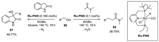 The ruthenium-PNN pincer-type ligand complexes (Ru-PNN) have also been utilized to direct the α-alkylation of unactivated amides (Scheme 36) [49]. Interestingly, alcohol reagent 86 was adopted as an alkylation reagent in conjunction with Ru-PNN catalyst under dehydrative conditions. These dehydrogenation–condensation–hydrogenation processes were achieved with the employ of a tridentate pincer ligand with a high turnover number (TON). This ruthenium-based reaction was successful for indolinone-type substrates, as well as acyclic tert-amides. This method could be applied to the synthesis of C3-alkylated 3-hydroxyindolin-2-ones via α-alkylation.