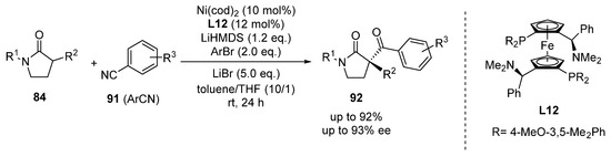 Stoltz and coworkers conducted the nickel-catalyzed enantioselective α-acylation of γ-lactams (Scheme 38) [51]. The reaction entails a three-component coupling of lactam enolates, benzonitriles, and aryl halides to provide α-quaternary-substituted lactams. The nickel/ Mandyphos-type ligand L12 complex induces enantioselectivity during ligand substitution and the insertion of benzonitrile 91 in the reaction with lactam enolate, derived from the corresponding lactam 84.