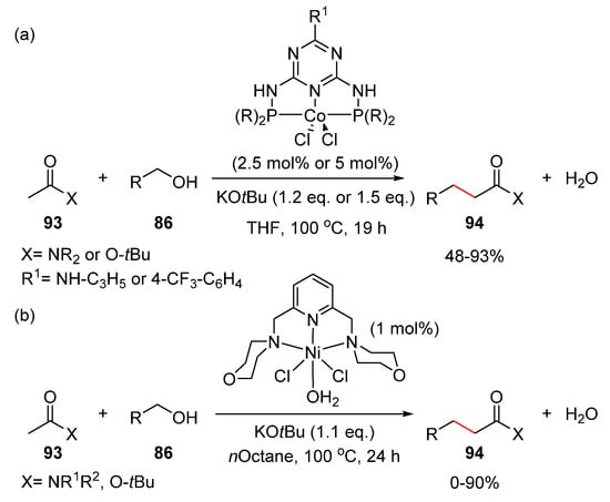 First-low transition metals have also been studied for the efficient α-alkylation of amides and esters. A metal-catalyzed hydrogen-borrowing strategy, the hydrogen autotransfer strategy, is described in Scheme 20, and this approach has also been applied to aldehydes, as well as amides and esters. The cobalt-catalyzed α-alkylation of unactivated amides and esters with alcohols was reported by Kempe and coworkers in 2016 (Scheme 39a) [52]. The α-position of the acetyl group in amides and esters 93 was successfully activated by a Co-PN5P-type catalyst and KtBuO. Primary alcohols 86 were employed as coupling partners for α-alkylation, and this methodology was performed under milder conditions, compared to those of previous transition metal-catalyzed α-functionalizations of unactivated amides or esters, and it exhibited good functional group tolerance. In addition, Ni-catalyzed α-alkylation of unactivated amides and esters 93 has been proposed (Scheme 39b) [53]. Tridentate NNN-pincer-type ligands displayed optimal catalytic activities with Ni in this transformation, and water was produced as the only byproduct of the reaction.