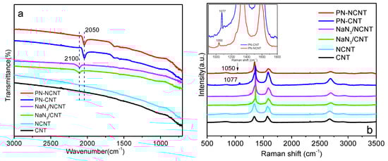 (a) ATR-FTIR and (b) Raman spectra of CNT, NCNT, NaN3/CNT, NaN3/NCNT, PN-CNT, and PN-NCNT (see 3. Materials and Methods for abbreviations).