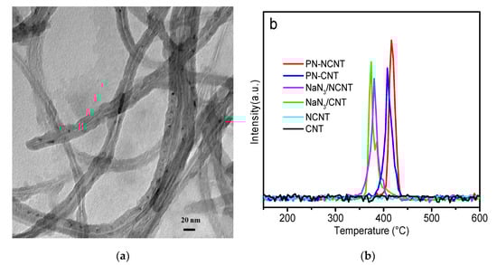 (a) TEM image of PN-NCNT and (b) N14 signal from TPD scans of CNT, NCNT, NaN3/CNT, NaN3/NCNT, PN-CNT, and PN-NCNT, respectively. The curves were normalized by sample weight (see 3. Materials and Methods for abbreviations).