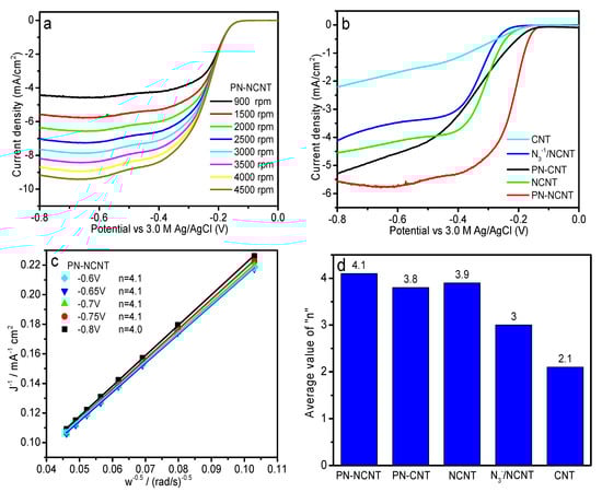 The electrocatalytic performance of PN-NCNT-GCE and PN-CNT-GCE electrode in oxygen reduction reaction was investigated by LSV measurements. O2-saturated 0.1 M KOH was the electrolyte. Prior to each measurement, background voltammogram was obtained by carrying out the LSV in a N2-saturated electrolyte, which was subtracted from the value as measured in O2-saturated electrolyte. The ORR polarization curves achieved at different rotating speeds were illustrated in Figure 3a (PN-NCNT) and Figure S1a–d (PN-CNT, NCNT, N3−/NCNT, and CNT). As expected, current density increased with the electrode rotating speed increase, which can be attributed to the enhanced diffusion of electrolytes [,].