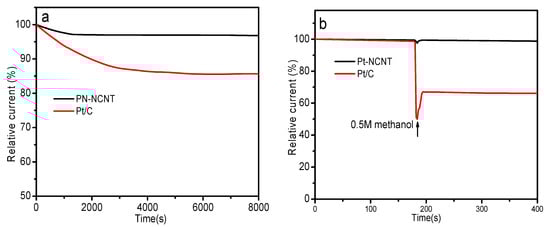We further evaluated the long-term stability of PN-NCNT catalysts using a chronoamperometric method (Figure 4a). A negligible decrease (~3.1%) was observed over PN-NCNT while almost 14.4% loss was detected on Pt/C catalyst, suggesting the much better stability of PN-NCNT. It can be attributed to the strong interactions between negatively charged polynitrogen chain phase N8− and positively charged carbon of NCNT substrate. Methanol crossover effect was further tested. 0.5 M methanol was injected into an oxygen-saturated 0.1 M KOH solution at a certain time during a chronoamperometric measurement. No obvious disturbance of the current was observed over PN-NCNT while sharp decrease occurred on Pt/C (Figure 4b), which indicated the superior methanol tolerance of PN-NCNT compared to Pt/C. These results together with the high activity suggest that PN-NCNT is a potential metal-free catalyst for oxygen reduction reaction in fuel cell application.