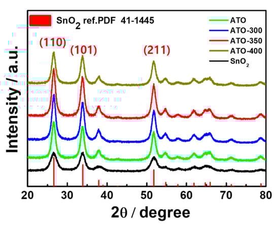 XRD patterns of the antimony-doped tin oxide (ATO) samples heated at different temperatures from 300 to 400 °C in an air atmosphere. (A tetragonal SnO2 structure with a = b = 4.74 Å, c = 3.19 Å (P42/mn(136) group, PDF 88-0287)).