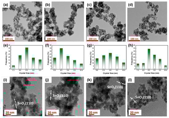 TEM images, size distributions, and high-resolution TEM images of ATO (a,e,i), ATO-300 (b,f,j), ATO-350 (c,g,k), and ATO-400 (d,h,l).
