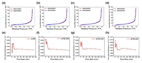 N2 adsorption-desorption isotherms and pore size distributions for ATO (a,e), ATO-300 (b,f), ATO-350 (c,g), and ATO-400 (d,h).