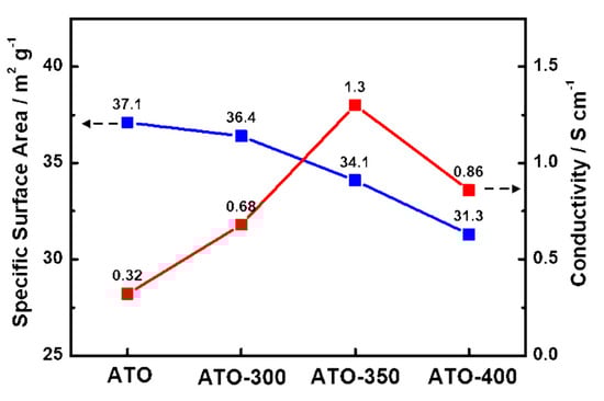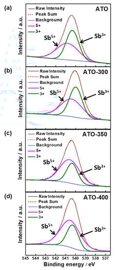 To confirm the specific surface area and pore structure of the samples, N2 adsorption/desorption characteristic curves were obtained, as shown in Figure 3 and Table 1. All the samples exhibited type IV curves, indicating a mesoporous structure for the ATO samples synthesized by the Adams fusion method. The specific surface areas of ATO, ATO-300, ATO-350, and ATO-400 were 37, 36, 34, and 31 m2 g−1, respectively. Furthermore, the dominant pore sizes of ATO, ATO-300, ATO-350, and ATO-400 were 19.4, 20.0, 21.2, and 22.5 nm, respectively. As the heating temperature increased, the specific surface area decreased, and the pore size increased due to a slight aggregation of the ATO particles. To investigate the chemical state of Sb in the ATO-samples, XPS analysis was performed (Figure 4). The amount of Sb measured by XPS in the ATO samples was determined to be ~5%, which is close to an optimum value for Sb [36]. The Sb 3d spectrum consists of two characteristic peaks for 3d3/2 and 3d5/2, located at ~540 and ~531 eV, respectively, because of spin-orbit interactions [37,38,39]. Practically, it is hard to analyze the accurate valence state of antimony by fitting the Sb 3d5/2 peak because of overlap with the O 1s peak. Thus, the Sb 3d3/2 peaks in the samples were fitted into the two chemical states of Sb3+ and Sb5+ at ~539.74 and ~540.71 eV, respectively. As shown in Table 2, with increasing heating temperature, the ratio of Sb5+ in the entire Sb state increased from 85% to 95%. The content of Sb5+ as a dopant in the SnO2 structure could be significantly related to its electrical behavior, i.e., conductivity. In other words, Sb5+ might play the role of the donor to enhance electrical conductivity, producing extra electrons in the conduction band of the Sb-doped SnO2 structure as an n-type semiconductor [38,39]. The electrical conductivities in the Sb-doped SnO2 samples heated at different temperatures were compared (Figure 5). The average conductivity values of ATO, ATO-300, ATO-350, and ATO-400 were 0.32, 0.68, 1.30, and 0.86 S cm−1, respectively. Compared to the ATO, the heated samples exhibited improved electrical conduction due to more activation of Sb5+ as a dopant in the SnO2 structure. Furthermore, the conductivity of the ATO samples increased with increasing heating temperature. The improved electrical conductivity of the doped ATO samples could be attributed to an increased Sb5+ ratio, i.e., an increased concentration of the activated Sb donors (Table 2). However, since annealing in air at 400 °C might lead to a decreased Sb5+ ratio due to an air-rich atmosphere, resulting in decreased electrical conductivity of the ATO-400, thus, the ATO-350 heated at 350 °C in the air could have an optimum conductivity.