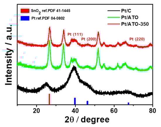 XRD patterns of Pt/C, Pt/ATO, and Pt/ATO-350.