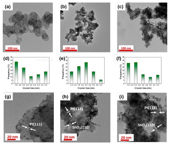 TEM images, size distributions, and high-resolution TEM images of Pt/C (a,d,g), Pt/ATO (b,e,h), and Pt/ATO-350 (c,f,i).