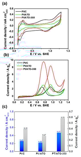 Cyclic voltammograms (CVs) for Pt/C, Pt/ATO, and Pt/ATO-350 measured with a scan rate of 50 mV s−1 (a) in Ar-saturated 0.5 M H2SO4 and (b) Ar-saturated 0.5 M H2SO4 + 2 M CH3OH at 25 °C. (c) Comparison of specific and mass activities of the supported catalysts measured at 0.65 V.