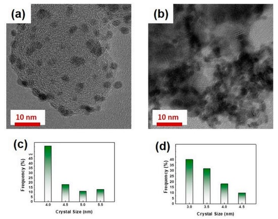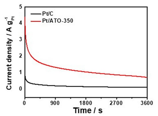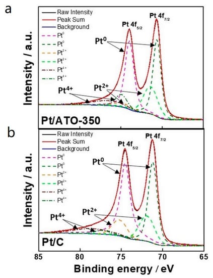 where QH is the charge amount of hydrogen adsorbed on the Pt catalyst, 0.21 mC cm−2 is the Coulombic charge (QH) associated with hydrogen adsorption of the polycrystalline Pt electrode, and MPt is an amount of the Pt loading on the working electrode. The EASAs of the Pt/C, Pt/ATO, and Pt/ATO-350 were determined to be ~9.5, ~4.3, and ~18.6 m2 gPt−1, respectively. To compare the electrocatalytic activity of the catalysts for the MOR, CVs were measured in Ar-saturated 0.5 M H2SO4 + 2 M CH3OH at a scan rate of 50 mV s−1 in the potential range 0.1–1.3 V (vs. SHE) (Figure 8b). The specific activities of Pt/C, Pt/ATO, and Pt/ATO-350 measured at 0.65 V, close to the onset potential for the MOR, were 0.26, 0.22, and 0.47 A cm−2, respectively (Table 3). Furthermore, the mass activities of Pt/C, Pt/ATO, and Pt/ATO-350 were 0.39, 0.27, and 0.58 A gPt−1, respectively. Overall, the electrocatalytic activity of Pt/ATO-350 was superior to that of Pt/ATO because of the improved electrical conductivity of ATO heated at 350 °C with an unchanged specific surface area of ATO. Compared to Pt/C, the electrochemical performance of Pt/ATO-350 could be attributed to the supported catalyst structure of the Pt nanoparticles deposited on the doped oxide support with high electrical conductivity and an optimum specific surface area [19]. Compared to oxide-supported Pt catalysts reported in the literature, Pt/ATO-350 exhibited improved electrocatalytic activity toward the MOR (Table 4) [7,24,40]. Furthermore, the electrocatalytic stability of the supported catalysts was evaluated by measuring the variation of current density at a constant potential of 0.7 V for 3600 s in Ar-saturated 0.5 M H2SO4 + 2 M CH3OH (Figure 9). The initial current values of Pt/C and Pt/ATO-350 were 0.91 and 4.37 A g−1Pt, respectively. After 3600 s, the MOR current densities of Pt/C and Pt/ATO-350 dropped to 0.12 and 0.73 A g−1Pt, respectively. Compared to Pt/C, Pt/ATO-350 exhibited superior electrocatalytic stability for the MOR, which could be attributed to Pt nanoparticles on the relatively stable oxide support with high conductivity and interaction between the Pt catalyst and the heated ATO support [24]. As shown in Figure 10, the average crystallite sizes of Pt/C and Pt/ATO-350 after the stability tests were ~4.4 and ~3.5 nm, respectively, increasing by 160% and 140%, respectively, from the values before the stability tests. However, compared to Pt/C, the relatively less increased catalyst size of Pt/ATO-350 indicated the superior stability of Pt/ATO-350 during the MOR. Figure 11 shows the Pt4f XPS spectra of Pt/C and Pt/ATO-350. Compared to Pt/C, the relatively lower binding energy shift of Pt4f in Pt/ATO-350 demonstrated a strong coupling effect between Pt and ATO with electron transfer between the ATO and the Pt [41,42,43]. Such an electronic effect between Pt and ATO could lead to the favorable adsorption of OH on Pt sites by facilitating the cleavage of intermediates during the MOR, resulting in an improved MOR activity. In addition, the strong metal-oxide support interaction could prevent aggregation of Pt nanoparticles during the MOR, resulting in an enhanced MOR stability.