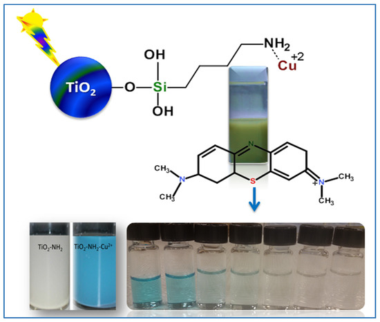 Materials: (3-Aminopropyl)trimethoxysilane, tetraethyl-titaniate (TEOT), hexadecyltrimethylammonium bromide (95%), hydrochloric acid, acetic acid, and methylene blue (CAS 61-73-4) were obtained from Sigma Aldrich (St. Louis, MO, USA), and copper sulfate was purchased from Merck, Feltham, (UK).