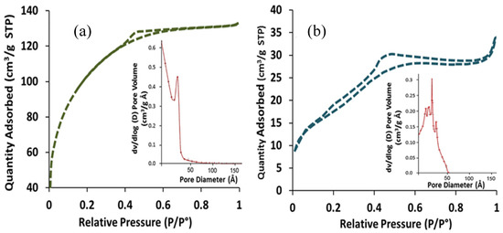 The Brunauer, Emmett and Teller (BET) specific surface area and pore size of the TiO2 and TiO2-NH2-CuxO samples were examined using nitrogen adsorption–desorption isotherms at 77 K, and the calculated values are shown in Table 1. The results revealed that the specific surface area of the as-synthesized TiO2 nanoparticle was 337 m2g−1 which is comparatively higher than other reported TiO2 nanoparticles [31]. The isotherm of TiO2 nanoparticles is illustrated in Figure 3a and shows the multilayer adsorption pursue capillary condensation consequential type IV isotherm, which confirms the mesoporous phase of the synthesized materials. Also, the measured pore volume and pore diameter of the TiO2 material was 0.322 cm3g−1 and 4.77 nm, respectively. Furthermore, the distribution of the pore size in Figure 3a (inset) showed a very narrow distribution which indicates a uniform pore distribution. On the other hand, the surface area of TiO2 nanoparticles decreased from 337 m2g−1 to 97 m2g−1 after surface modification with an amine (TiO2-NH2), and further attachment to CuxO (TiO2-NH2-CuxO). The reduction in surface area was mainly due to the deposition of surface functional groups, and attachment of CuxO on the surface of the TiO2 nanoparticles which could cause a barrier and obstacles to the N2 molecules entering through the pores and cause a non-uniform pore distribution, as shown in Figure 3b.